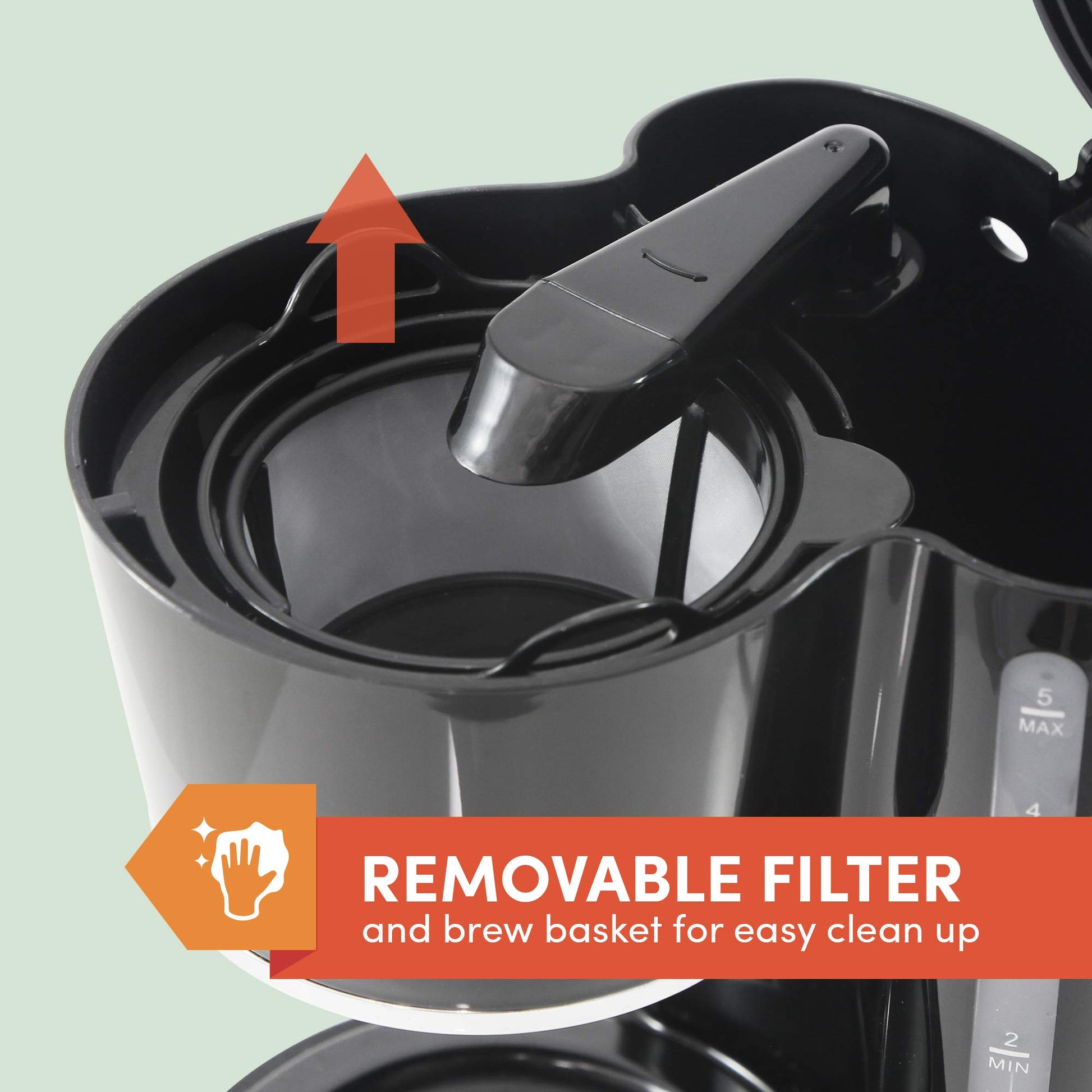 - RE-USABLE FILTER with removable filter basket is easy to clean and better for the environment by reducing the need for paper cone filters.