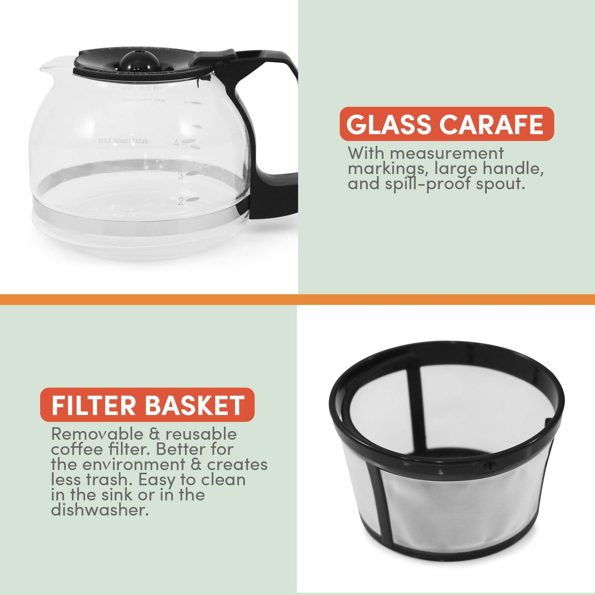 - 4 CUP GLASS CARAFE for brewing the perfect quantity of hot fresh coffee for an individual or a small group of people.